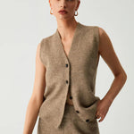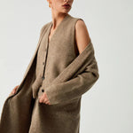 Design: Un set elegant din trei piese care include un cardigan lung și fluid, un top interior ajustat și pantaloni drepți cu talie înaltă. Designul coordonat oferă un aspect rafinat, dar fără efort.