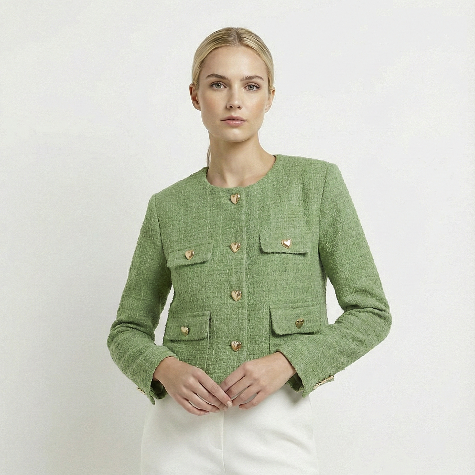 Fiecare detaliu a fost gândit pentru a oferi un aer de rafinament discret: de la croiala tip cropped care avantajează silueta, până la nasturii aurii în formă de inimă, care adaugă o notă romantică și exclusivistă.