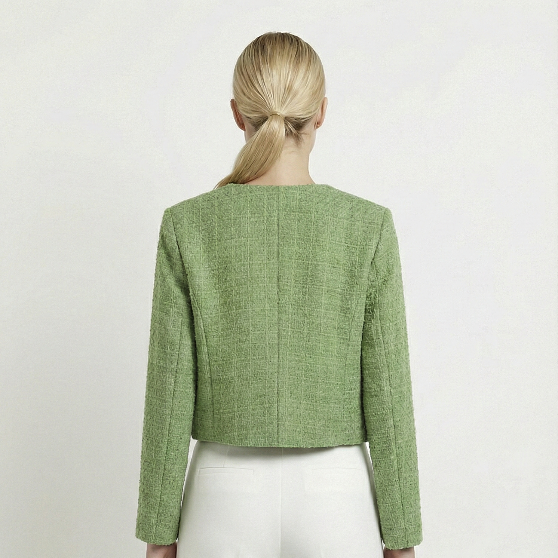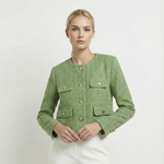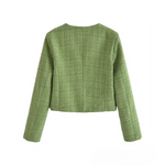 Redefinește eleganța clasică cu jacheta Daria. O piesă statement care îmbină farmecul atemporal al texturii tweed cu un design modern și feminin. Într-o nuanță vibrantă de verde smarald, această jachetă este piesa centrală de care orice garderobă sofisticată are nevoie.