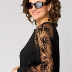 • Echilibru între Acoperire și Transparență: Mânecile din tull cu broderii florale permit pielii să se întrevadă într-un mod subtil și elegant, oferind lejeritate ținutei fără a expune brațele în mod excesiv.